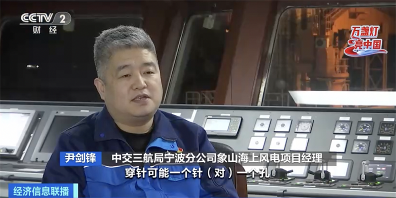 中交三航局宁波分公司象山海上风电项目经理 尹剑锋:叶片是平行对接的,对接的难度就更大。我们形容叫“百米高空穿针引线”,穿针可能一个针对一个孔,像我们这个孔多的达到一百七十几个孔,全部要对准,这个难度就可想而知。
