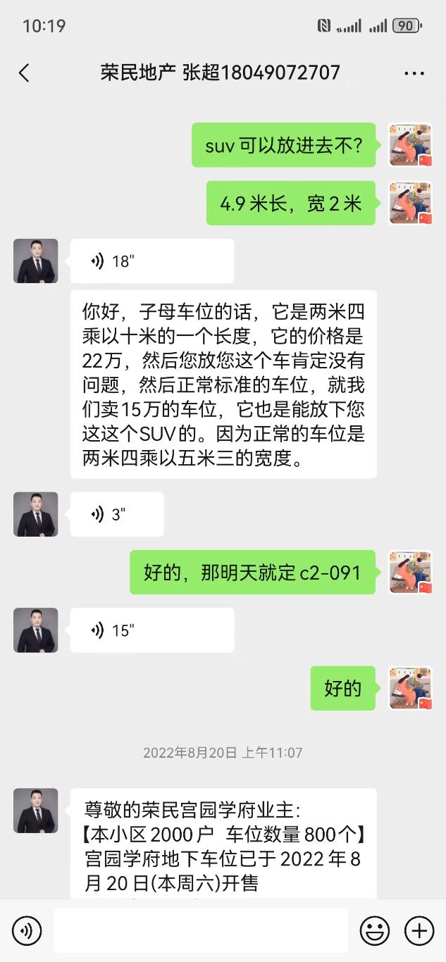 本人何飞鹏,西安临潼人。我于2022年8月20日在西安市灞桥区荣民宫园学府购买地下停车位(车位号:c2-091),付款人民币22万元整。当时荣民宫园学府的员工张超通过微信介绍,该子母车位总长为2.4米×10米,完全可以放入一辆轿车和一辆suv车,可经过实际测量该车位总长只有9.36米,放入两辆汽车后,前车头部伸出车位白线40公分。荣民地产与我只签订了该车位的使用协议,一直不签署正式合同。