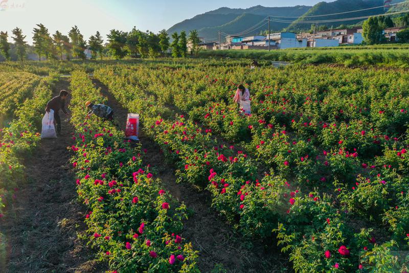 5月10日6时,在位于秦岭脚下的西安市长安区引镇街道嘉午台村的重瓣红玫瑰田里,村民抓紧没有蜜蜂和重瓣红玫瑰花尚无全开留有香气的有利时机采摘花瓣。