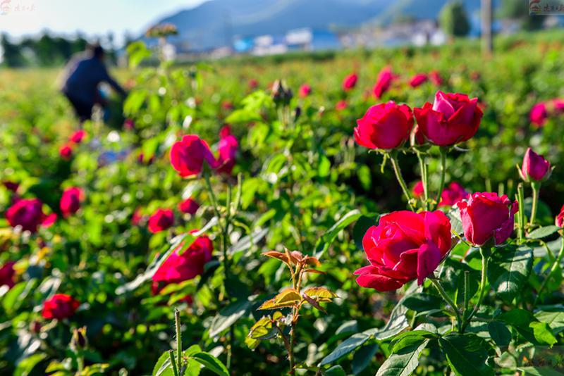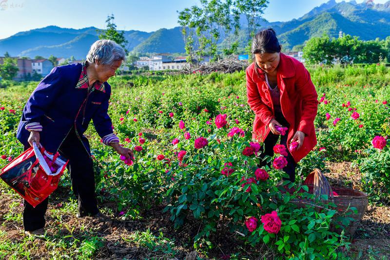 据了解,该村已有50多年栽种重瓣红玫瑰的历史。重瓣红玫瑰不仅具有较高的食用、药用、养颜美容的功能和作用,还能助力花农增收。据悉,2023年,该村栽种的重瓣红玫瑰给花农每亩带来近万元的收入。(记者 袁景智文/图)