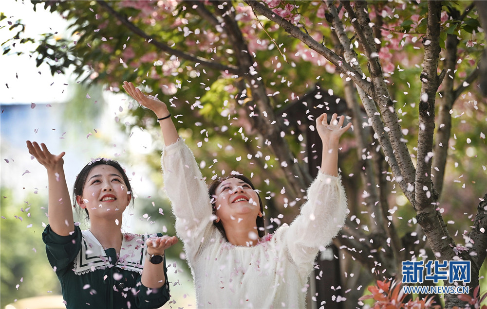 4月19日,行走在洛南县城街道上市民感受飘落的樱花花瓣。新华网发(林夕 摄)