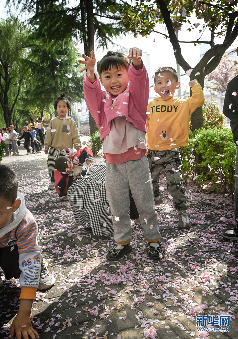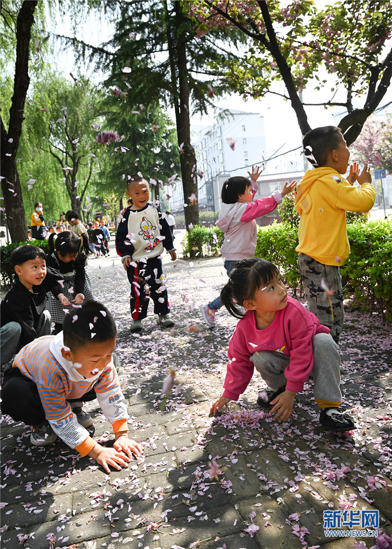 4月19日,幼儿园放学的孩子在洛南县城人行道旁捡拾落下的樱花花瓣。 新华网发(林夕 摄)