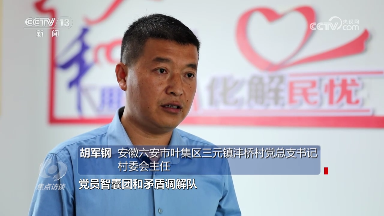 安徽六安市叶集区三元镇沣桥村党总支书记、村委会主任胡军钢:“‘三个三分之一’是三个部分组成,第一个是矛盾双方,还有一个三分之一是村里成立的党员智囊团和矛盾调解队,另外一个三分之一是村里出一个干部,然后镇里(再出人),纠纷属于哪一类,我们可以把他们邀请过来。如果是房屋产权问题或者边界问题,我们可以邀请司法部门、镇里司法所,如果矛盾双方比较激动,我们也可以邀请综治中心。”