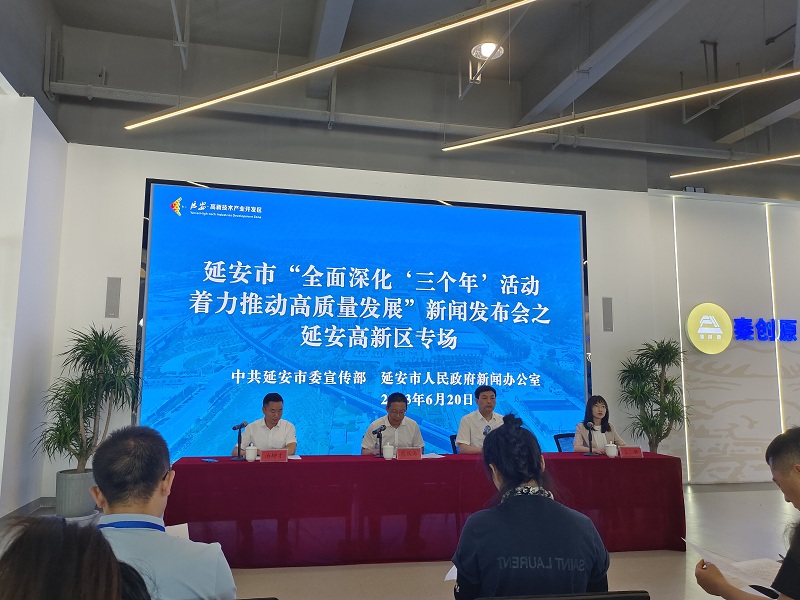 阳光讯(记者 郑玮)6月20日上午,中共延安市委宣传部、市政府新闻办组织召开“全面深化‘三个年’活动,着力推动高质量发展”系列现场新闻发布会之延安高新区专场。延安高新区党工委副书记、管委会主任高庆海,高新区经济发展局局长袁百亮,高新区科技创新局副局长王静出席新闻发布会,介绍高新区开展“三个年”活动相关情况。