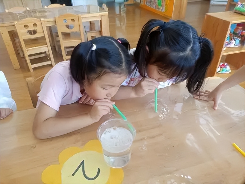 在活动中幼儿的泡泡水被用光了,为了能够让幼儿吹出更多的泡泡,探索泡泡的奥秘,孩子们打算自己制作泡泡液。