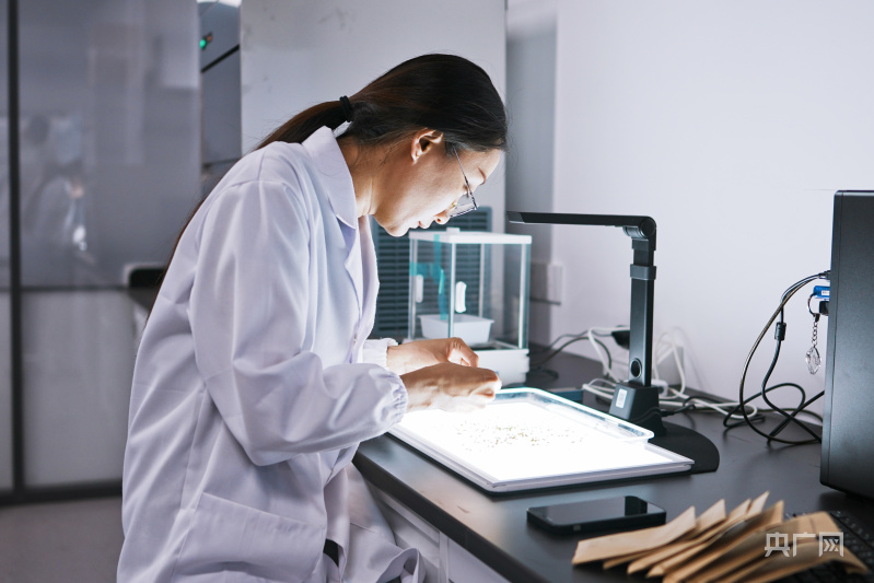 科研人员在实验室进行考种工作(央广网记者 张羲轮 摄)