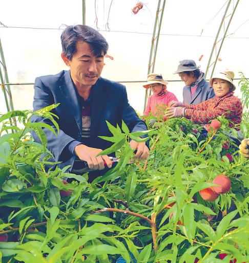 陕西省援藏项目、普兰县现代农牧业示范基地负责人郭巨亮(左一),在指导普兰镇吉让居委会加兴组群众剪枝。
