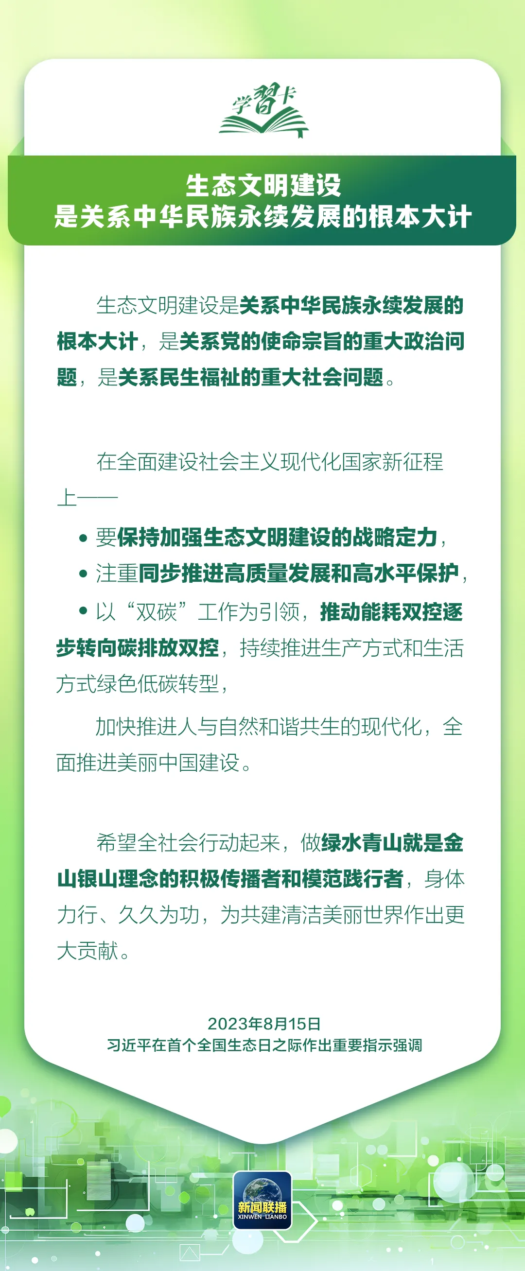 关于让绿色低碳发展成为解决生态环境问题的治本之策,加快形成绿色生产方式和生活方式,总书记有不少重要论述,在第二个全国生态日到来之际,让我们一起学习↓