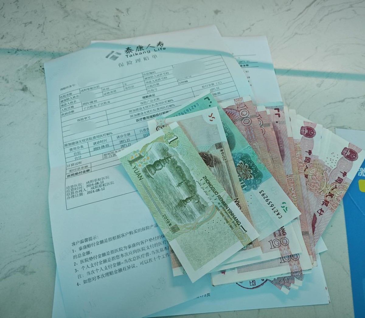 2024年8月客户z女士,因子宫肌炎在咸阳彩虹医院住院,住院期间联系代理人报案,适逢咸阳彩虹医院健保通系统测试上线,代理人协助客户进行健保通登记与免押金申请,8月12日客户痊愈出院,泰康工作人员与代理人一起,陪伴客户进行健保通结算。