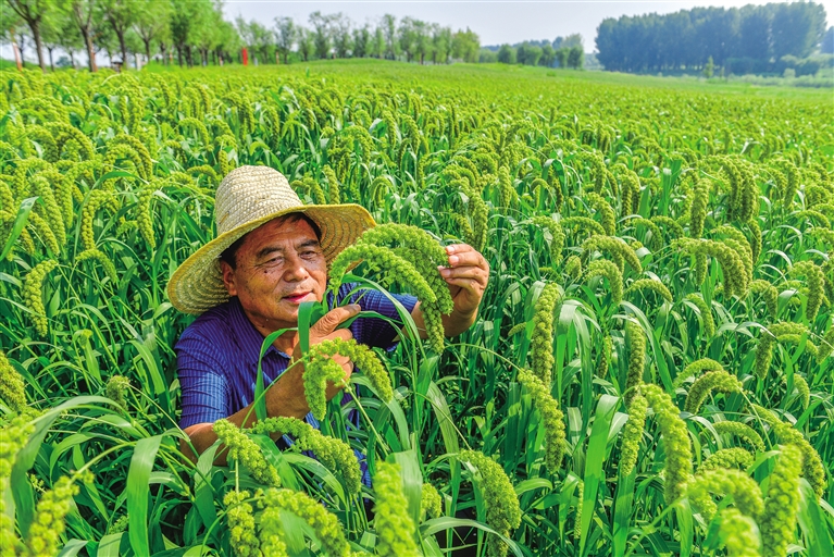 8月14日,沣河河畔,西安市长安区种粮大户、西安正社小麦玉米专业合作社负责人薛拓看着眼前沉甸甸的谷穗高兴地说:“成了,今年试种的秦杂谷6号一代杂交谷成了。”