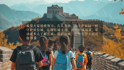 希望大家接续努力、久久为功,像守护家园一样守护好长城,弘扬长城文化,讲好长城故事,带动更多人了解长城、保护长城,把祖先留下的这份珍贵财富世世代代传下去,为建设社会主义文化强国、推进中国式现代化贡献力量。