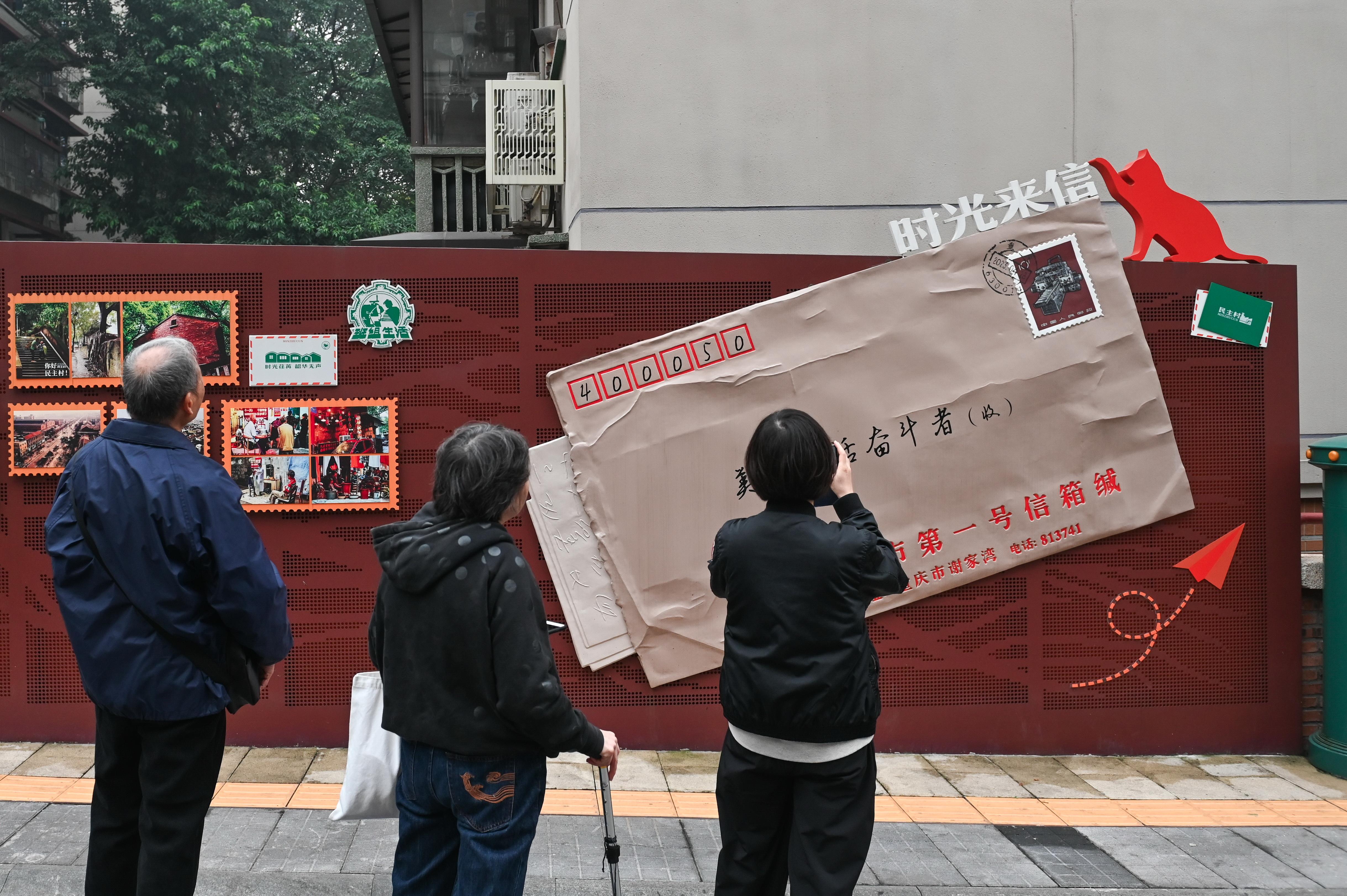 在重庆市九龙坡区民主村社区,一封寄给“美好生活奋斗者”的巨大信封,几乎铺满一面红色的墙。市井烟火气与新潮现代的时尚范儿融合交织,让这里成为新晋网红打卡地。